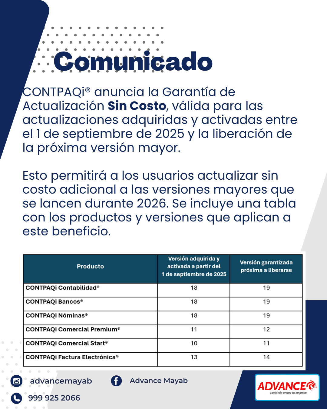 Nos complace anunciarte que, con el objetivo de apoyar a nuestros usuarios en la actualización de sus sistemas tradicionales, ofreceremos la Garantía de Actualización Sin Costo, esto quiere decir, que las actualizaciones adquiridas y activadas a partir del 01 de septiembre 2025 y hasta la fecha de la liberación de la versión mayor, contarán con garantía de actualización sin costo para las versiones mayores que se liberarán durante el 2026.