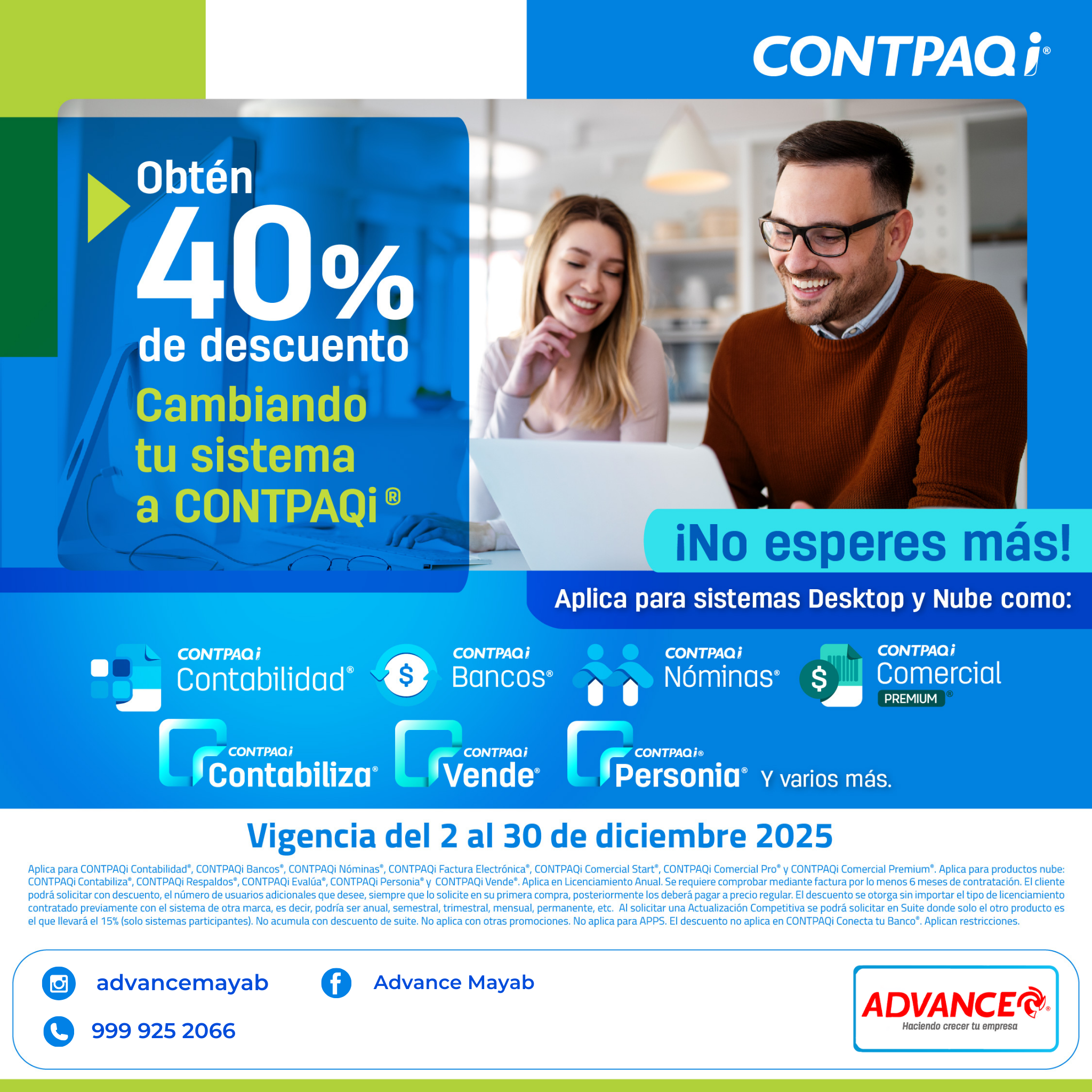 Cambia tu licencia CONTPAQi y recibe un 40% de descuento por tiempo limitado.