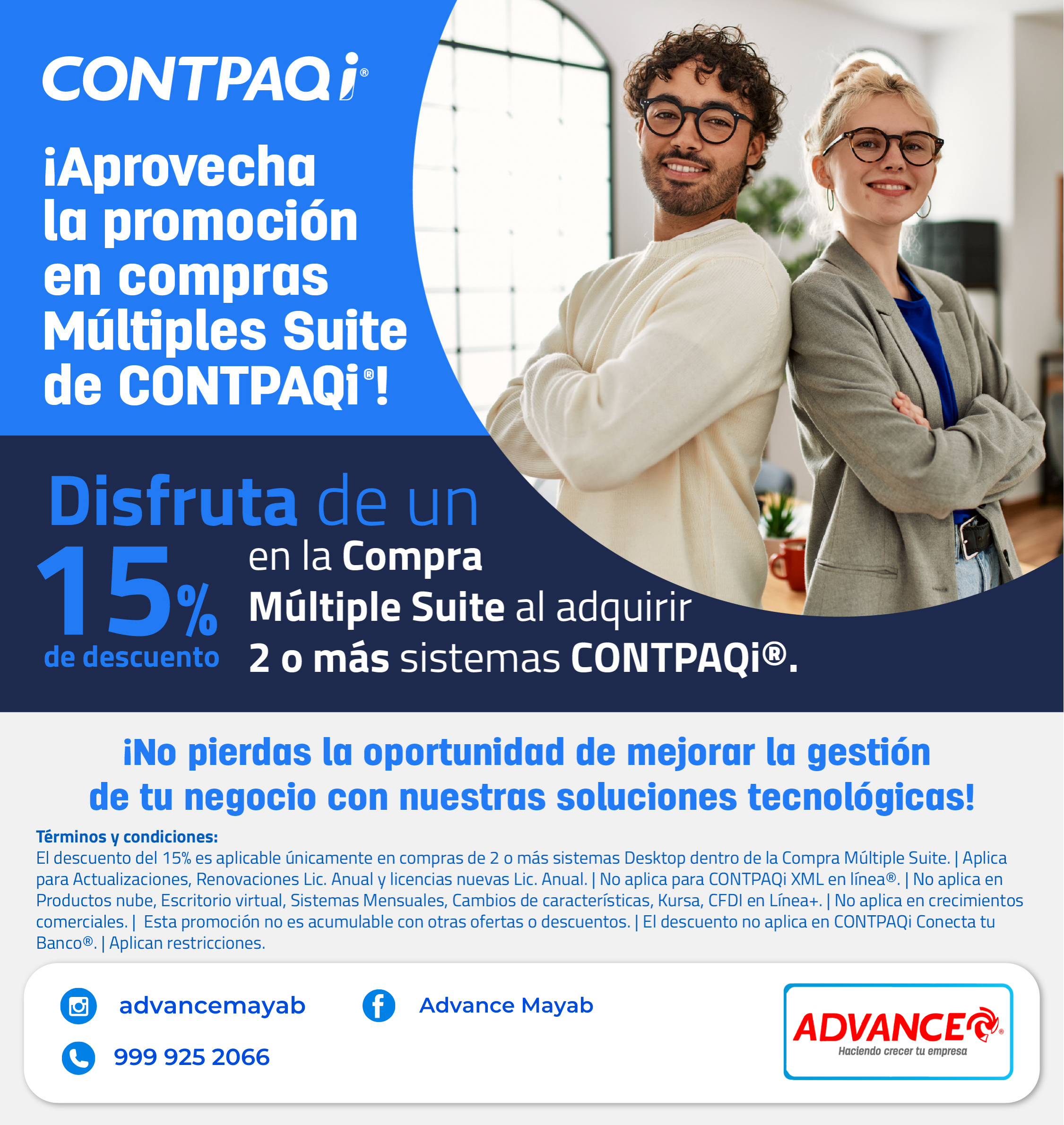 Aprovecha la promoción en Compras Múltiples Suite de CONTPAQi® y obtén un 15% de descuento al adquirir 2 o más sistemas.